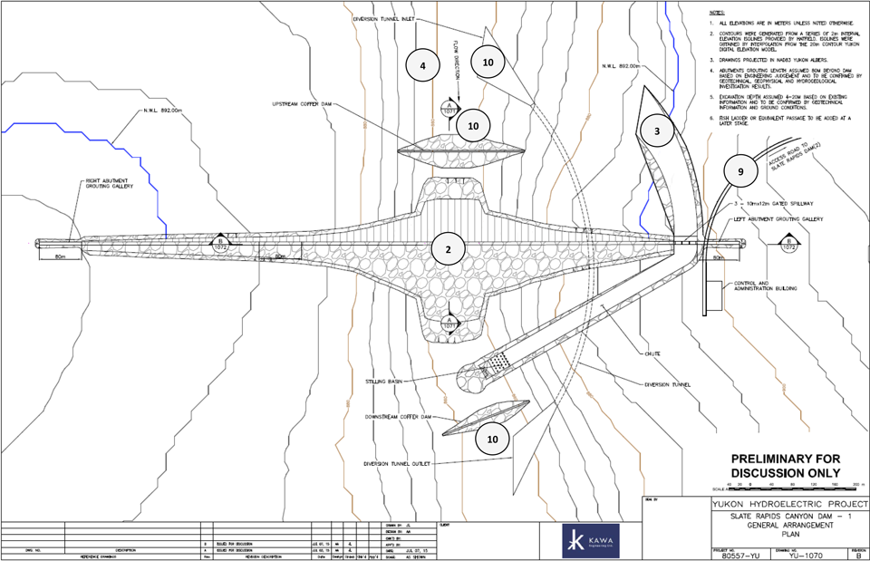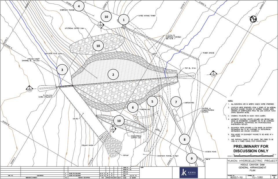 26 – The powerhouse, switchyard and transmission line are not shown on the drawing because their location is further downstream of the dam. The transmission line is expected to follow approximately the access road from the switchyard to the interconnection point.
