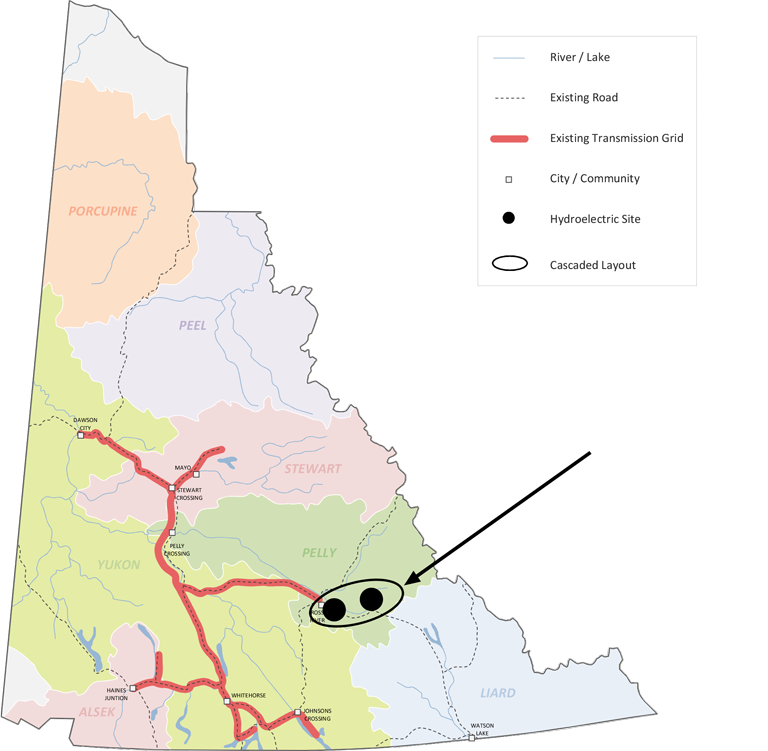 Slate Rapids + Hoole Canyon ROR is a cascade of two sites with Slate Rapids located upstream on the Pelly River providing both water storage and generation, and Hoole Canyon ROR located downstream operating as a run-of-river facility with no water storage (but a headpond needed to create head for generation purposes).