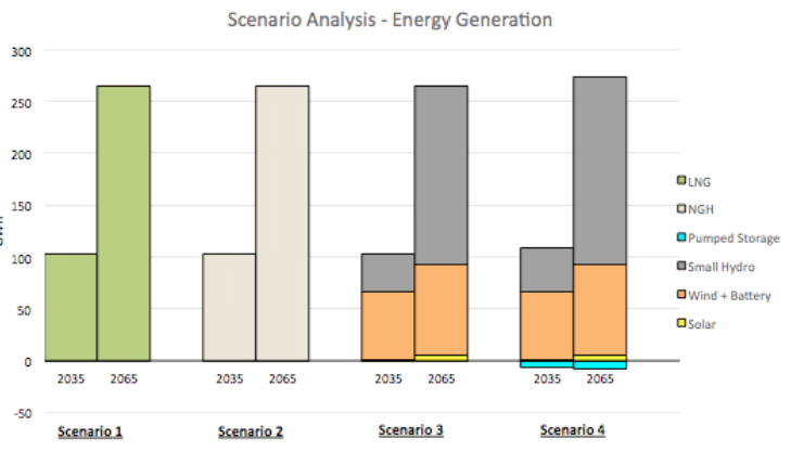 Seven different energy alternatives were compared and then packaged into four scenarios that reflect how each of the energy sources could work together.